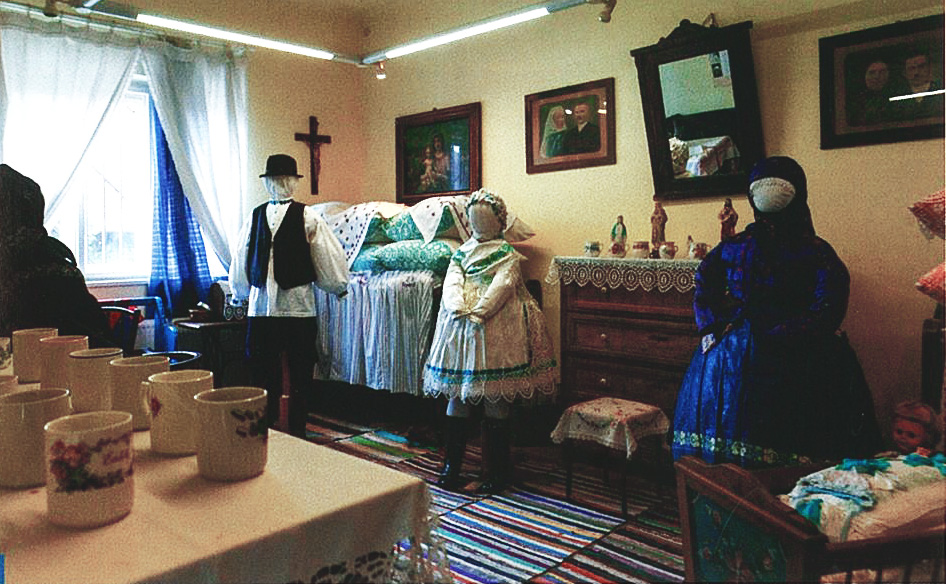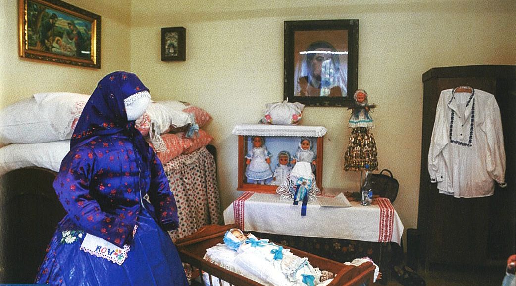 A gyűjtemény értékes darabja az itt álló 1912-ből származó bölcső. A benne fekvő baba fiúnak van öltöztetve, ezt a kék színű szalag árulja el. A kislányok rózsaszín szalagot hordtak.
